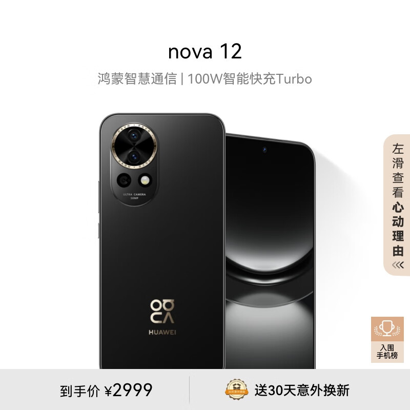 华为nova 12 100W智能快充Turbo 前置6000万4K超广角人像 256GB 曜金黑 鸿蒙智慧通信华为智能手机价格:2999.00元!