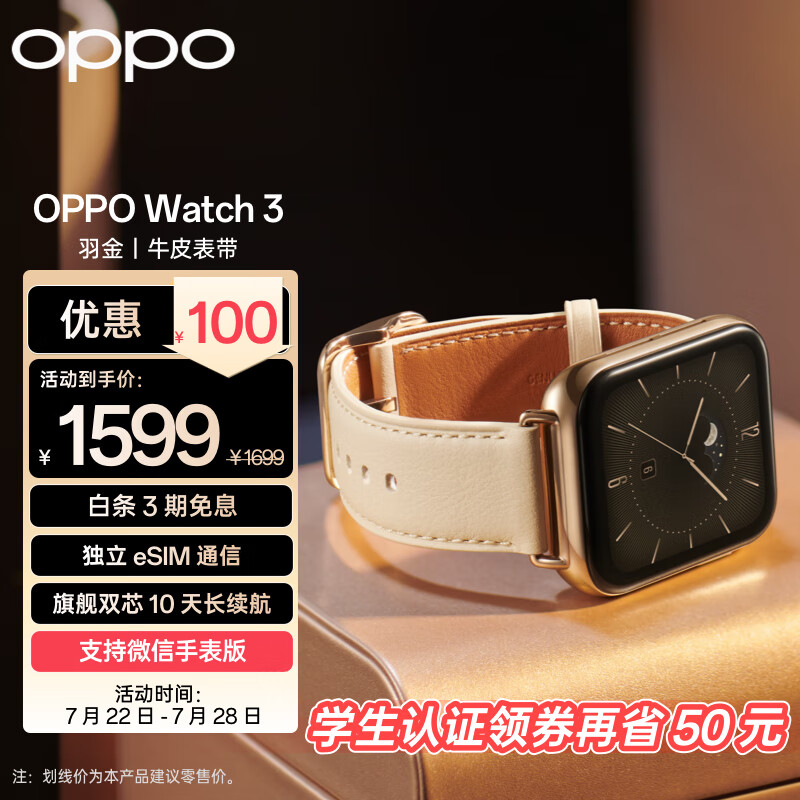 OPPO Watch 3 羽金 全智能手表 运动健康手表男女eSIM电话手表 血氧心率监测 适用iOS安卓鸿蒙手机价格:1599.00元!