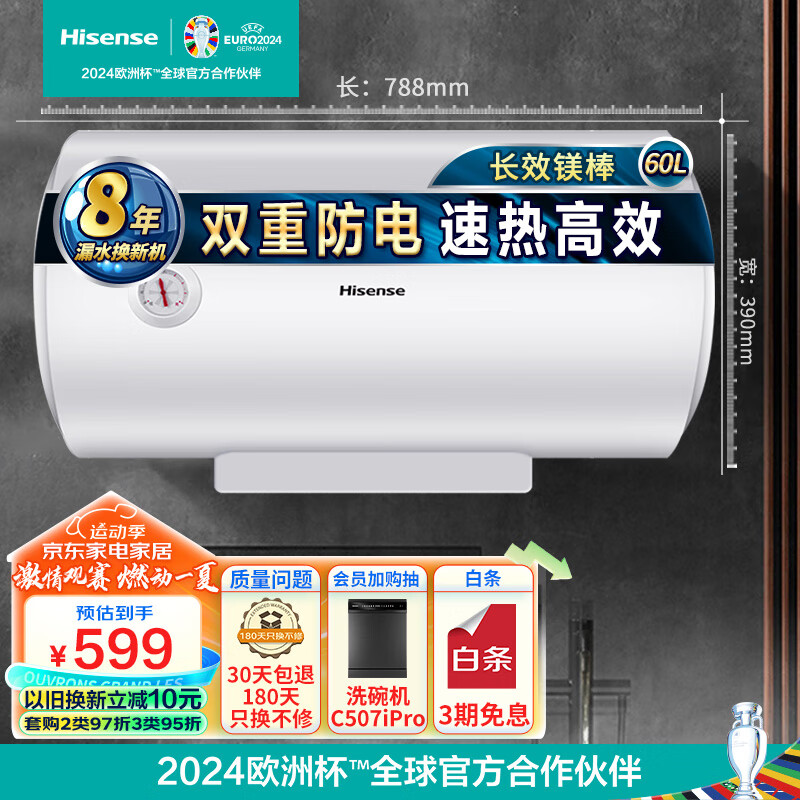 海信(Hisense)60升家用电热水器2100W速热加粗有芯长效镁棒升级防电墙多重防护DC60-W1311【以旧换新】价格:599.00元!