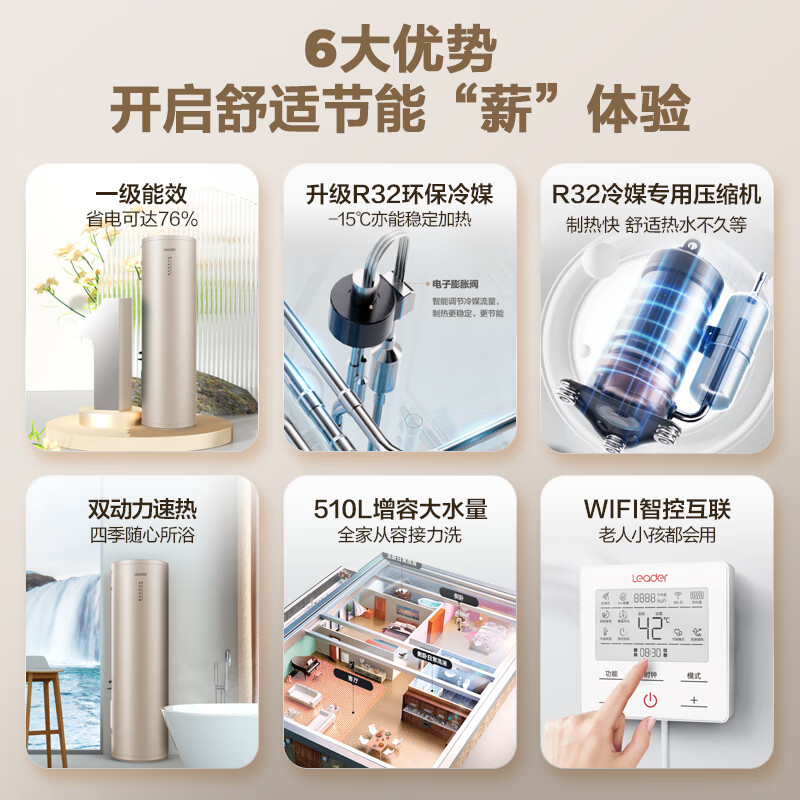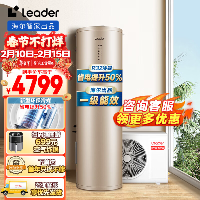 海尔(Haier)出品Leader空气能热水器200升一级能效电辅升级R32冷媒WiFi多重安防LKF75/200-JAD7NU1(4-6人)价格:4799.00元!