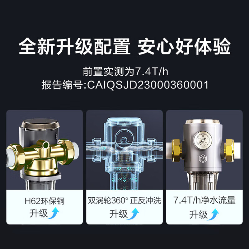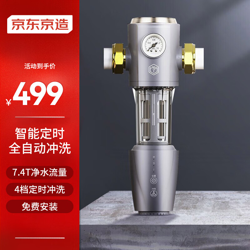 京东京造 前置过滤器 智能自动冲洗顶配 7.4T/h净水流量升级 40微米精滤水压监测 全屋净水器 免费安装价格:499.00元!