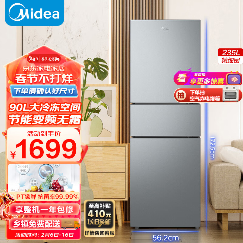 美的(Midea)235升三门家用小型冰箱三开门风冷无霜变频节能省电净味保鲜租房不占地电冰箱BCD-235WTPM(E)价格:1899.00元!
