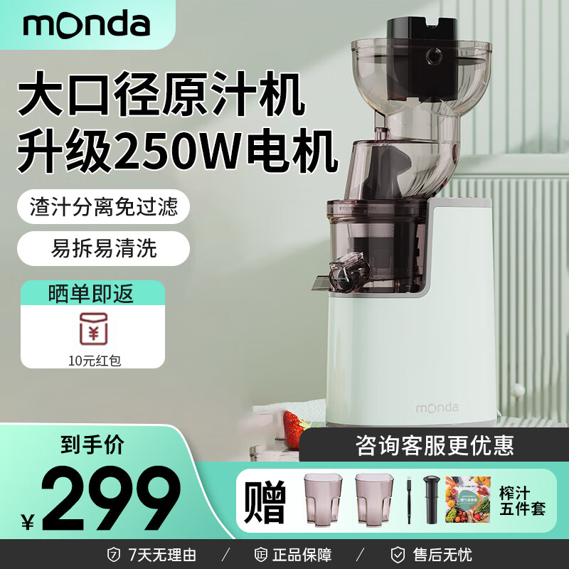 monda蒙达原汁机多功能大口径家用全自动低速电动冷压榨果蔬榨汁机破壁豆浆养生果汁机渣汁分离SJ-09清新绿价格:299.00元!