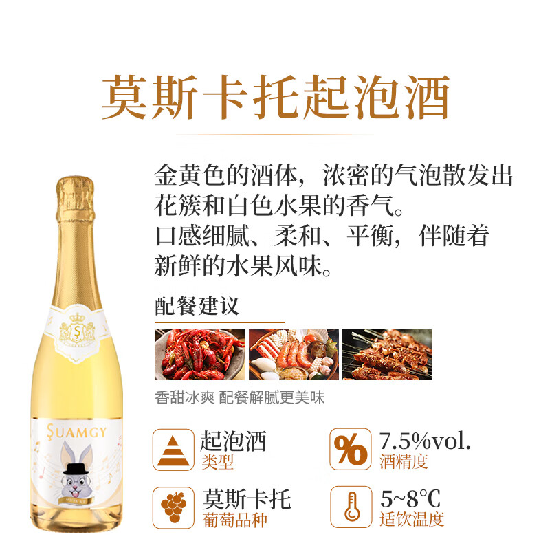 圣芝(Suamgy)莫斯卡托高泡起泡酒甜白葡萄酒 750ml 单瓶装 法国进口价格:99.00元!