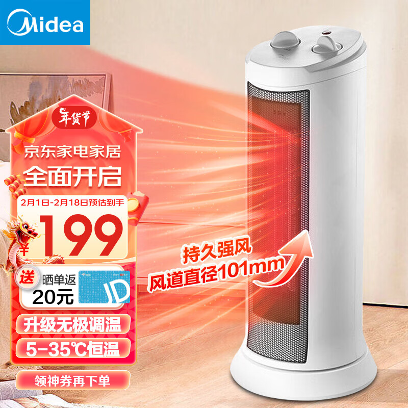 美的(Midea)取暖器 暖风机家用 恒温电暖器 电暖气片 电热烤火炉 立式无极调温节能省电摇头速热双档热风机 【立式入门 性价比优选 超级单品】价格:239.00元!