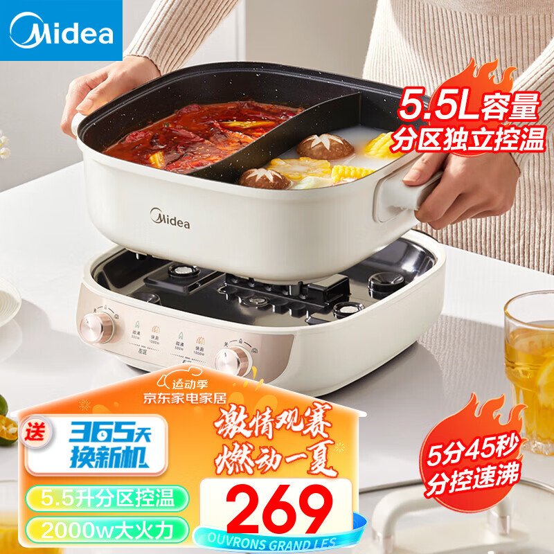 美的(Midea)电火锅 分区控制鸳鸯锅 电煮锅火锅专用锅电锅火锅锅多功能锅分体式家用电热锅电炒锅多用途锅 【5.5L】分区控制分体鸳鸯锅 HGS282813价格:349.00元!