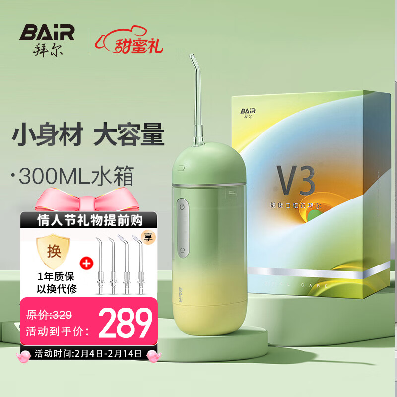 拜尔V3 电动冲牙器 伸缩便携式正畸洗牙声波式去除超水牙线牙套清洗洁牙神器 送朋友 礼盒装 布蕉绿价格:309.00元!