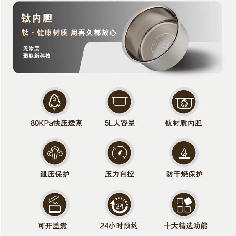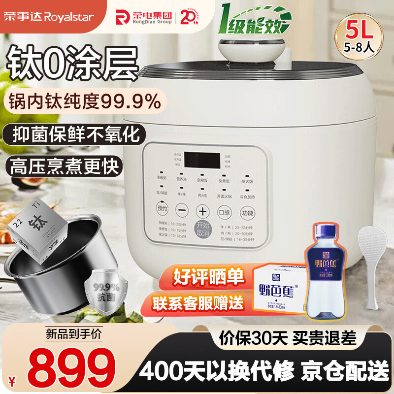 荣事达0涂层电高压锅电锅纯钛内胆多人家用持久沸腾开盖收汁高聚能养生煲5升YDG50-100A221T价格:899.00元!