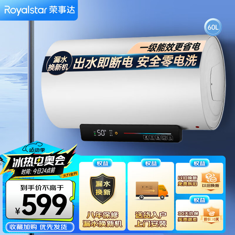 荣事达(Royalstar)60升电热水器家用储水式热水器2200W速热大水量一级能效节能省电 智能出水断电RSD-TD22-60价格:649.00元!