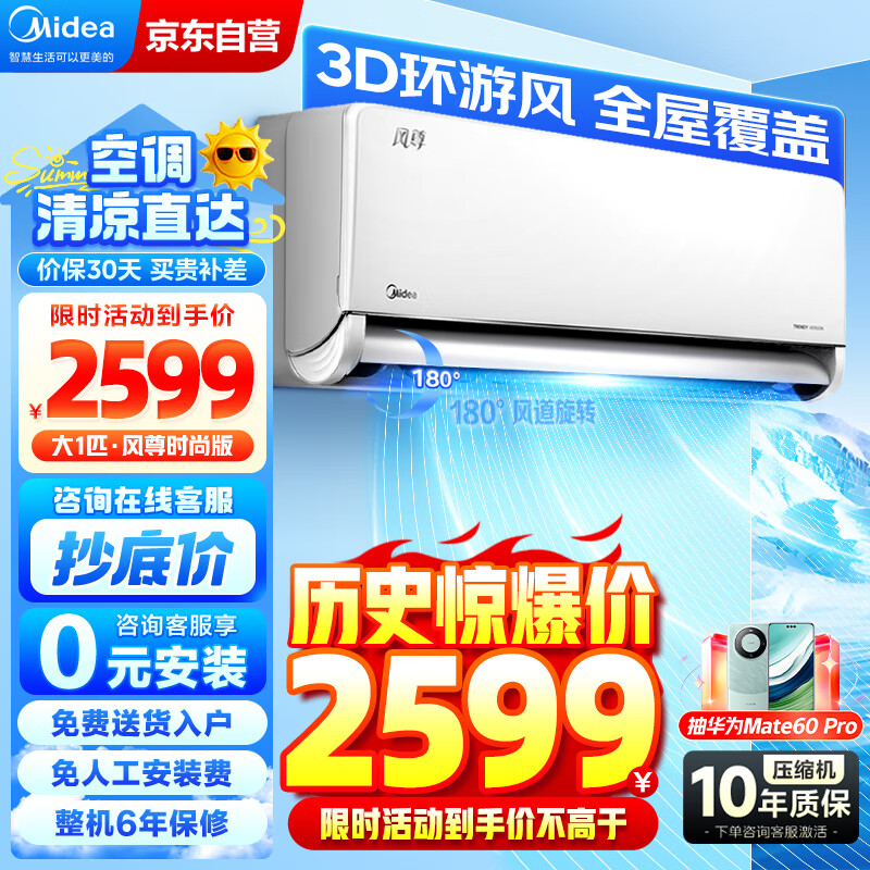 美的(Midea)空调大1匹挂机 风尊时尚版 新一级能效 变频冷暖 节能省电 壁挂式 KFR-26GW/N8MXC1 卧室书房空调价格:2599.00元!