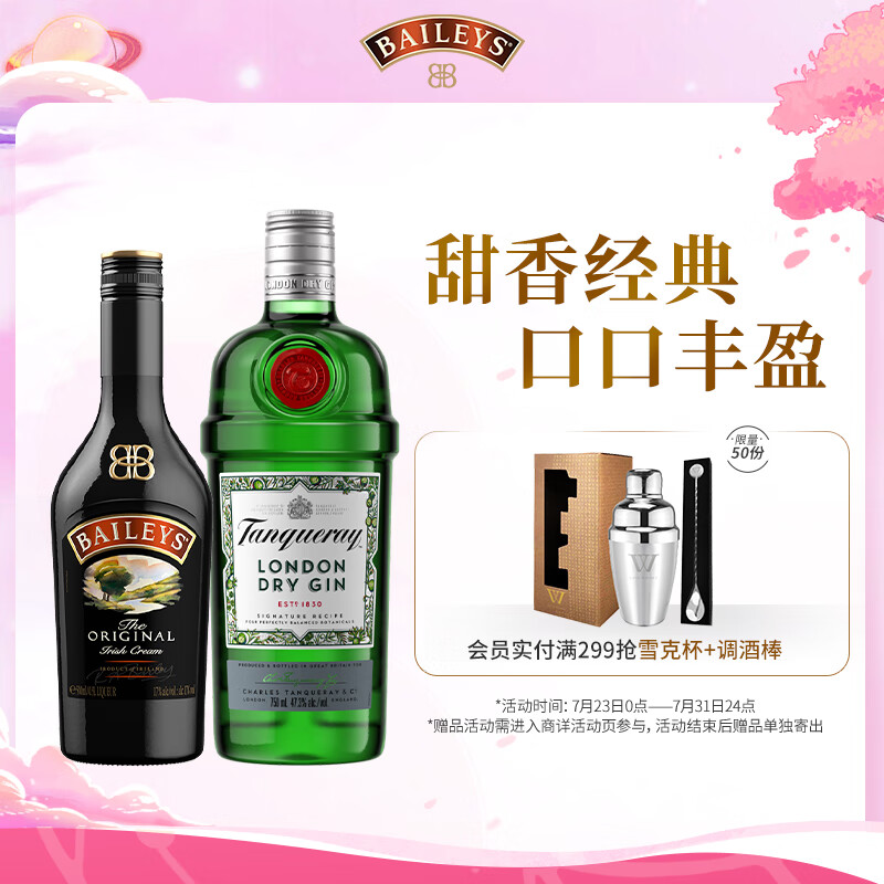 百利(Baileys)甜酒 力娇酒 原味500ml+添加利伦敦干味金酒 调酒基酒750ml价格:172.00元!