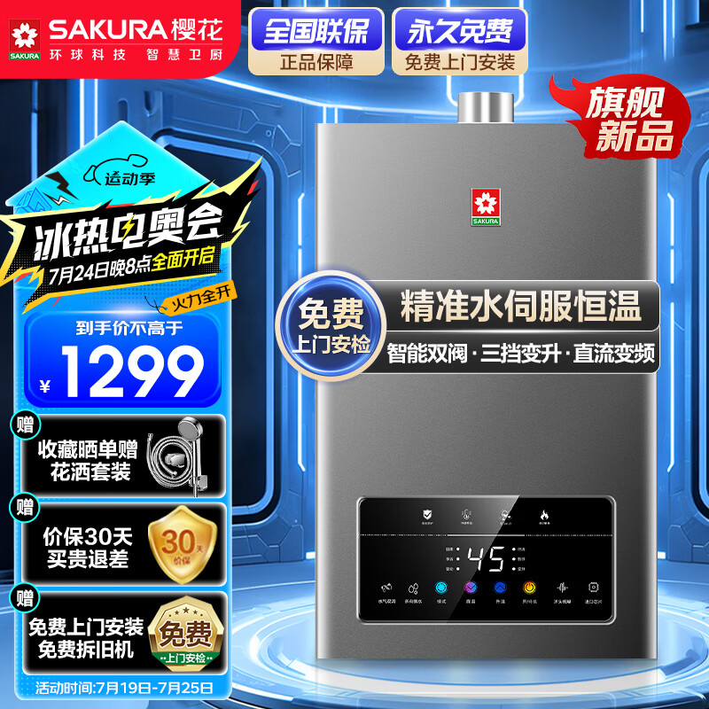 樱花(SAKURA)13升燃气热水器天然气双重降噪直流变频风机水伺服精控恒温低压启动数码显示三档变升JSQ25-JSP511价格:1499.00元!