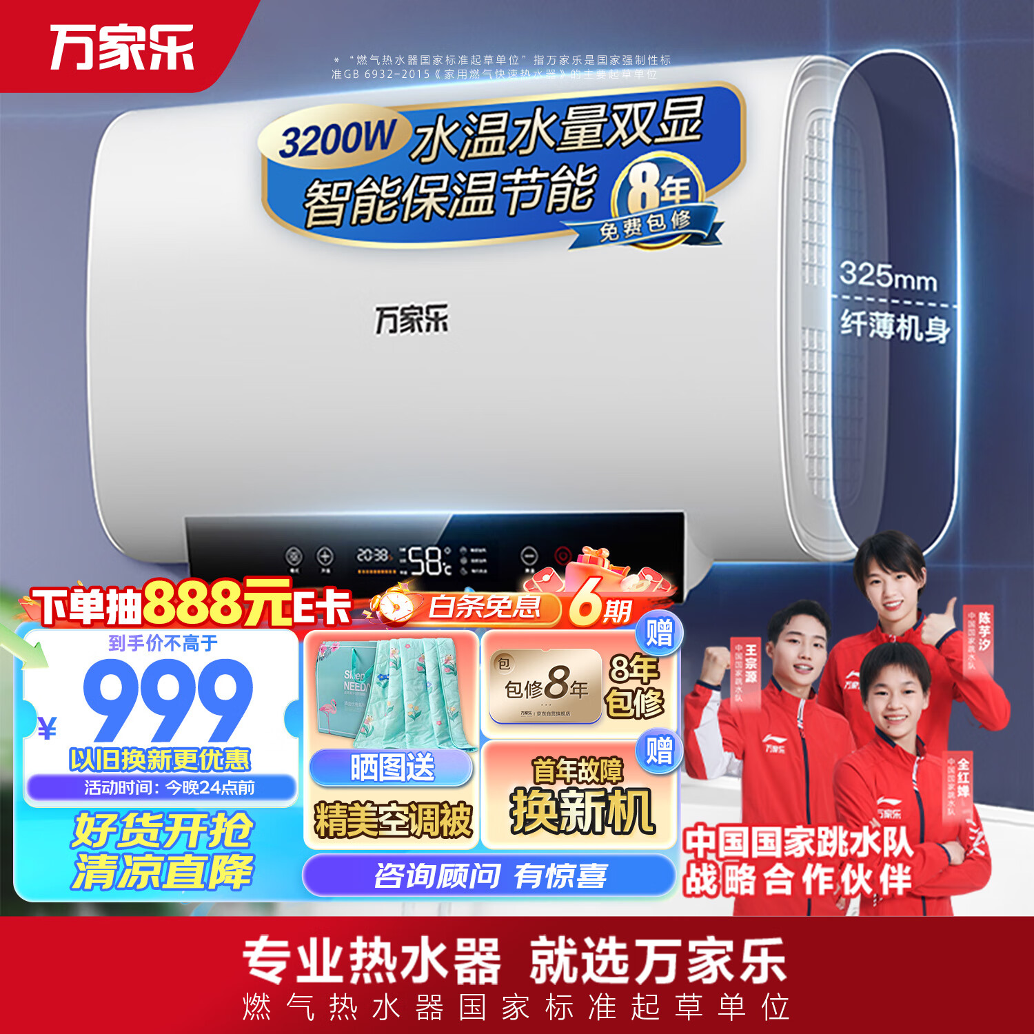 万家乐电热水器扁桶60升储水式双胆3200W速热 预约洗澡 水量水温双显 智能记忆D60-DB1价格:999.00元!