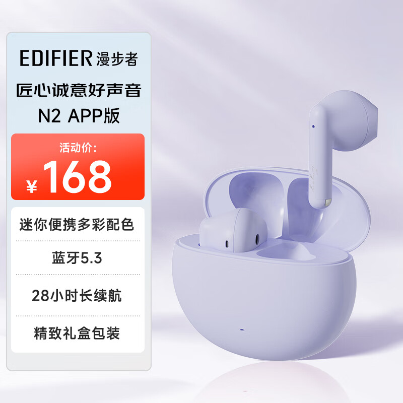 漫步者(EDIFIER)N2真无线蓝牙耳机 通话降噪 音乐耳机 蓝牙5.3 X2升级版 适用苹果华为小米手机 伊甸紫价格:168.00元!