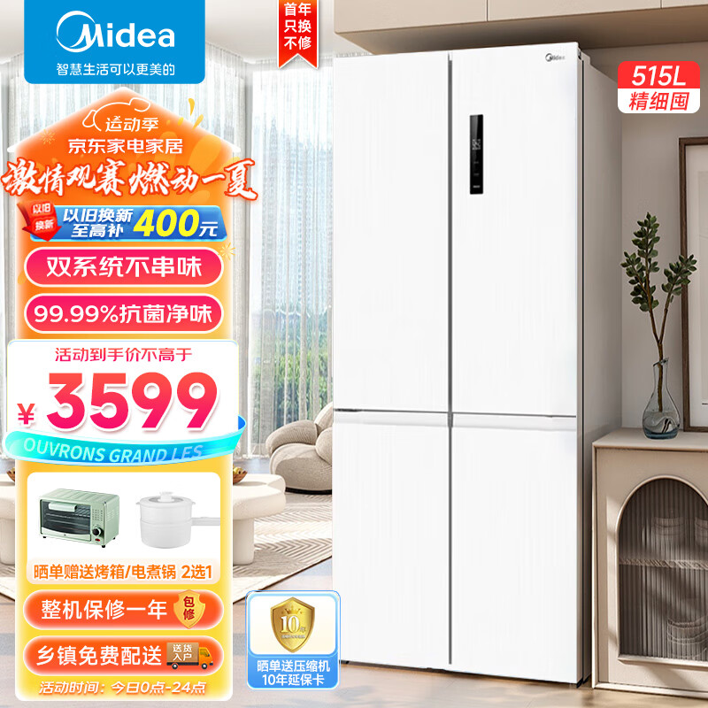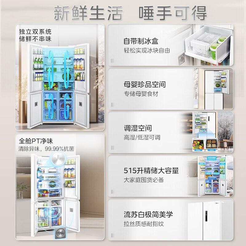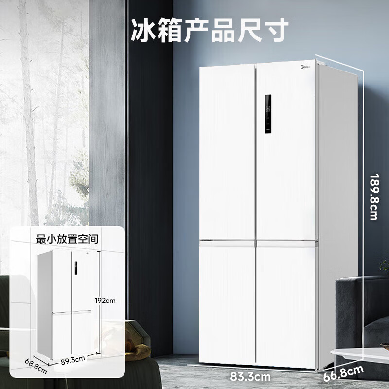 美的(Midea)540十字四开门冰箱家用变频一级能效双系统大容量风冷无霜独立制冰盒智能冰箱 MR-540WSPZE白色价格:4299.00元!