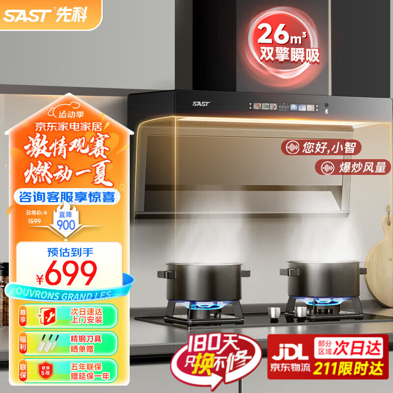 先科(SAST)顶侧双吸抽油烟机燃气灶烟灶套装家用厨房大吸力脱排式7字吸油烟机灶具套装 行业爆款/26立方爆吸+语音+彩屏+LED大灯价格:1499.00元!
