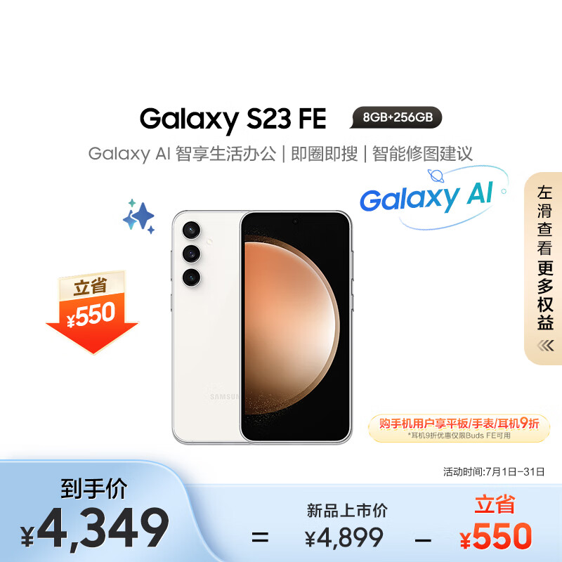 三星(SAMSUNG)Galaxy S23 FE AI手机 双光学防抖 5000万像素 拍照手机 同声翻译 5G长续航手机 8GB+256GB 晴云白价格:3599.00元!