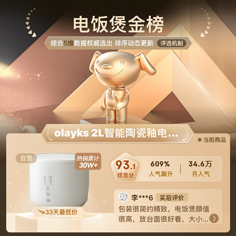 olayks立时 电饭煲 电饭锅 米饭锅 陶瓷釉球釜内胆多功能家用不粘锅智能柴火饭 2升2-3人价格:159.00元!