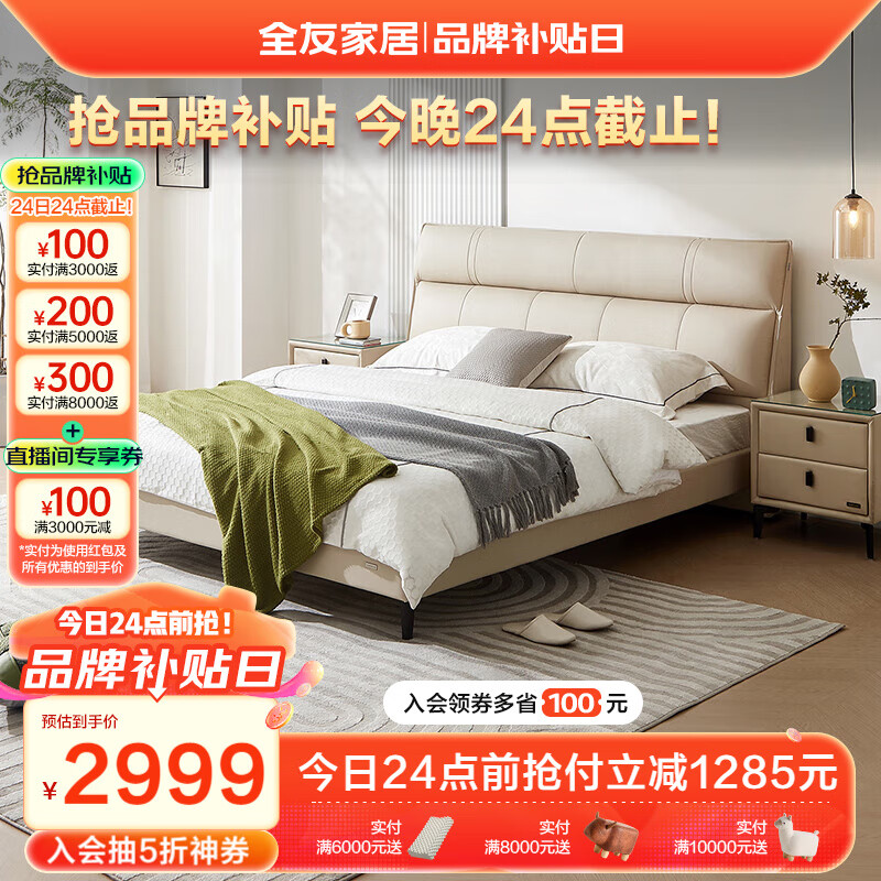 全友家居 头层牛皮床真皮床现代简约卧室高脚双人床1.5米x2米116033价格:4284.29元!