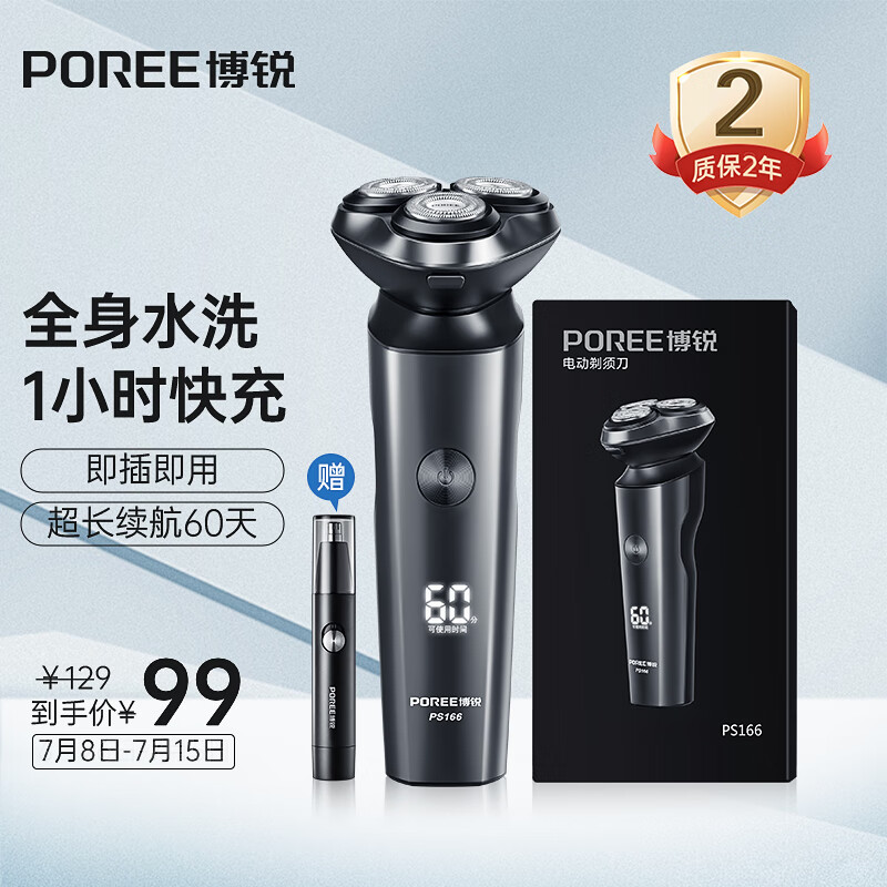 博锐电动剃须刀男士刮胡刀车载充电便携式三刀头礼物胡须刀快充全身水洗理容套装博锐PS166价格:99.00元!
