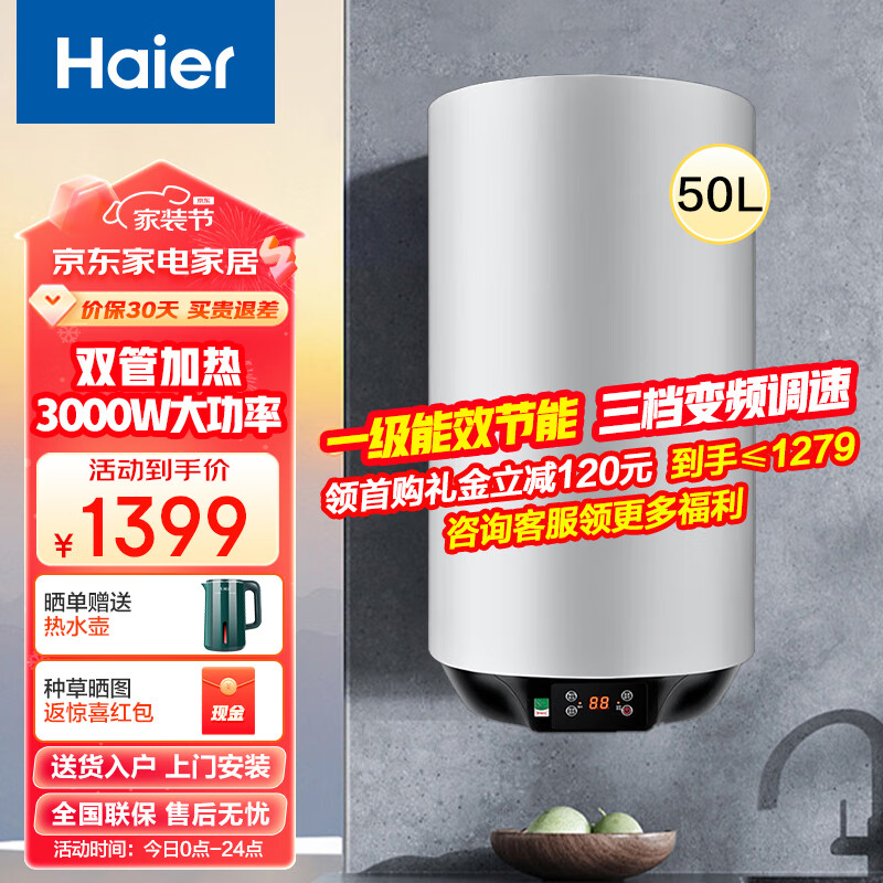 海尔(Haier)50升立式热水器 3000W大功率 三档变频一级能效节能 家用竖式储水式即热恒温增容洗澡淋浴防电墙U1价格:1399.00元!