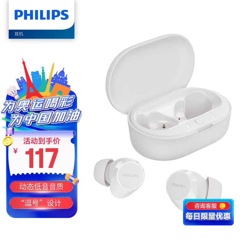 飞利浦(PHILIPS)豆式入耳耳机真无线蓝牙耳机运动耳机游戏耳机回音降噪智能配对苹果华为手机TAT1209白色价格:117.00元!