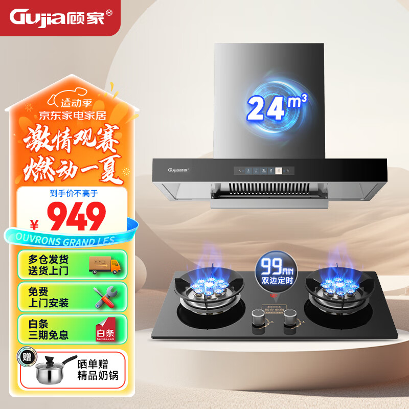 顾家(Gujia)抽油烟机灶具套装24爆炒大吸力家用欧式顶吸油烟机5.2KW燃气灶两件套(天然气)价格:1249.00元!