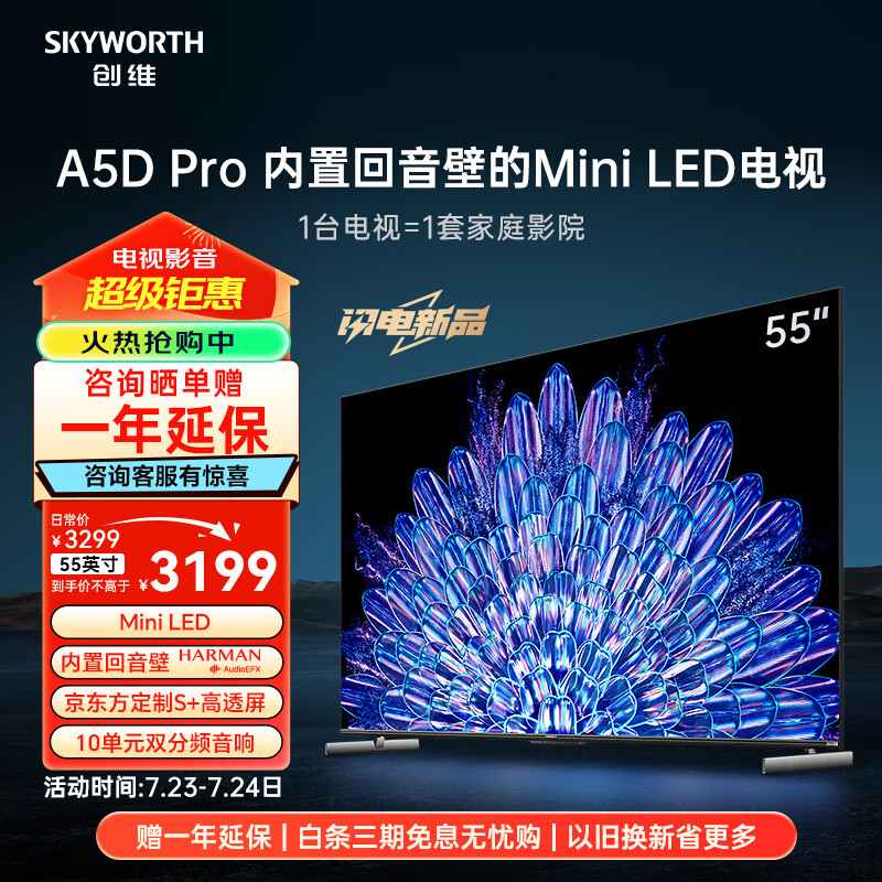 创维电视55A5D Pro 55英寸 内置回音壁的Mini LED电视 S+高透屏 144Hz高刷 4K高清护眼液晶平板电视机 55英寸 内置回音壁Mini LED价格:3199.00元!