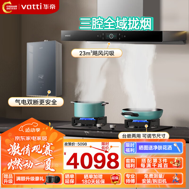 华帝(VATTI)油烟机灶具热水器套装官方厨房三件套三腔启世S3欧式抽油烟机23立方大吸力挥手自动清洗i11180 【品质三件套】180+73B+12151恒温16L价格:4098.00元!