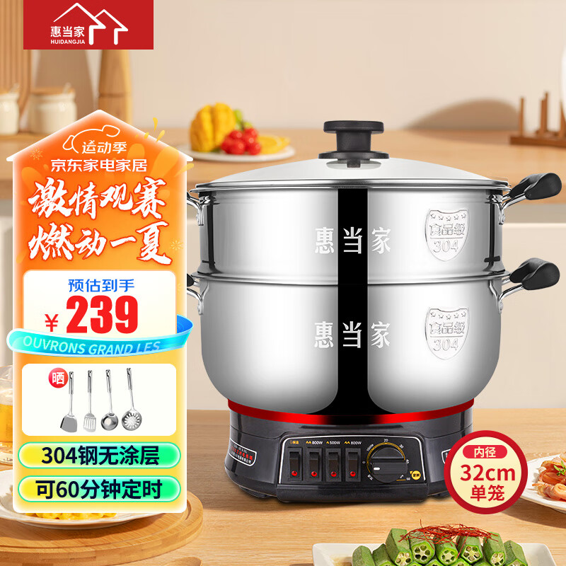 惠当家(Hui Dang Jia)电锅多功能电热锅定时电煮蒸锅电炒锅多用途锅电火锅304不锈钢锅 32cm单笼【定时款】 5L价格:239.00元!