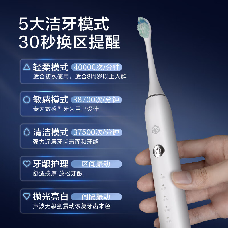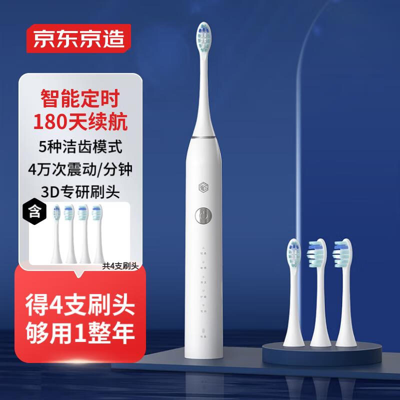 京东京造 电动牙刷成人 5种洁齿模式 声波震动牙刷电动【带4支电动牙刷头】男生生日礼物女实用 JZ3白价格:96.90元!