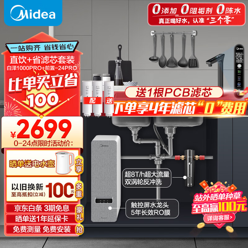 美的(Midea)省芯直饮净水器套装【白泽1000Gpro+前置过滤器-24pro】厨下式智能水龙头 RO反渗透家用一体净饮机价格:2699.00元!