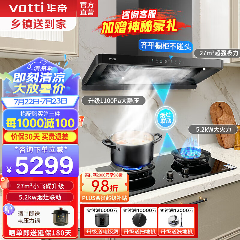 华帝(VATTI)【超级新品】小飞碟欧式超薄抽油烟机i11S35官方三腔S35顶吸顶侧一体26风量变频烟灶联动自清洗 S35P+309L27风量+5.2KW丨烟灶联动 天然气价格:5599.00元!