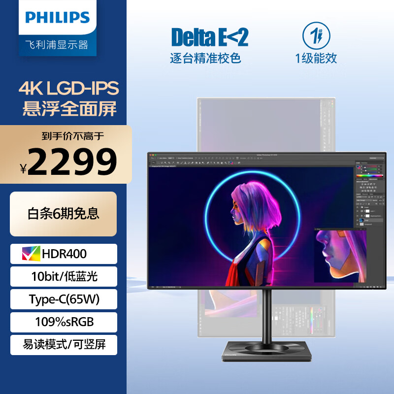 飞利浦 27英寸4K LGD-IPS悬浮屏 10bit出厂校准HDR400 TypeC 办公显示器 专业设计屏 IF 红点奖279C9价格:2299.00元!