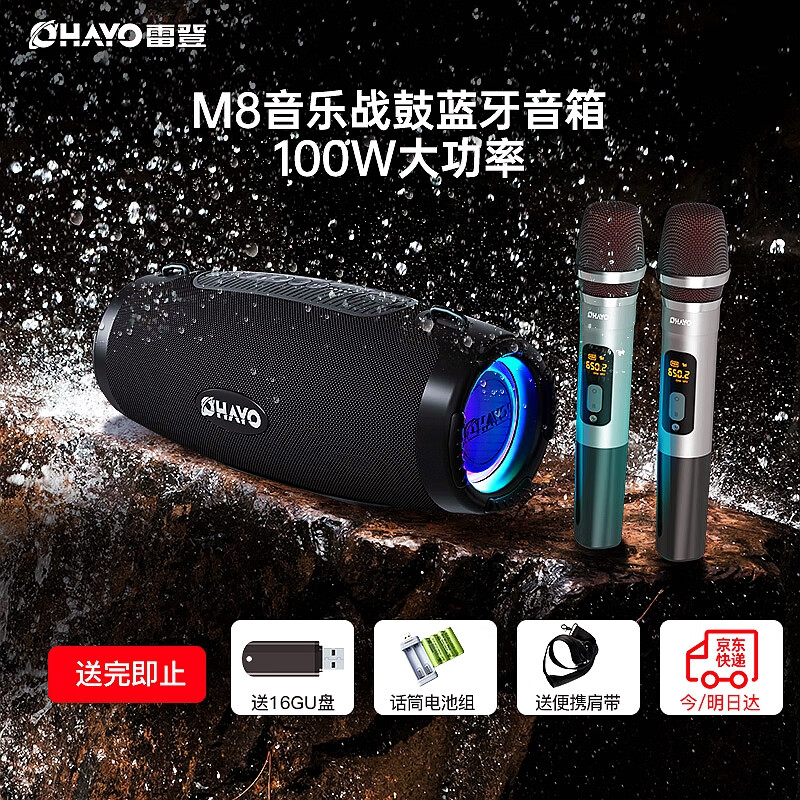 雷登(OHAYO)M8户外K歌音响100W蓝牙音箱声卡一体机大功率三喇叭双振膜立体声重低音炮混响广场舞直播送双麦价格:709.00元!