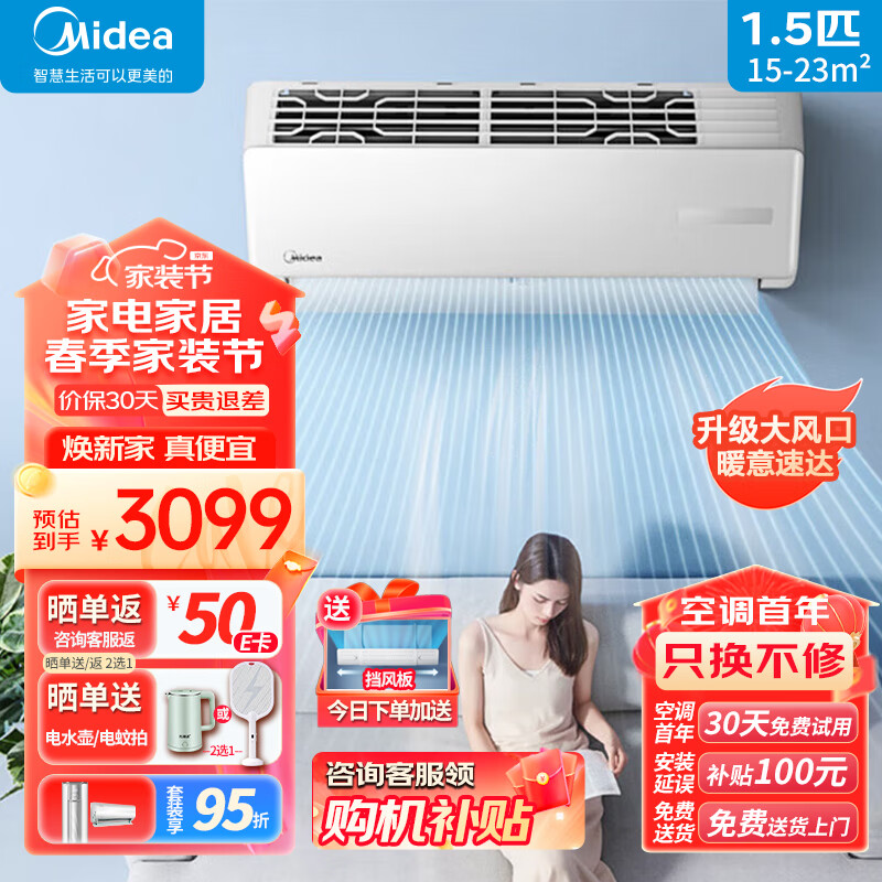 美的(Midea)空调1.5匹挂机 全直流变频冷暖空调 独立除湿 壁挂式 卧室书房空调挂机 KFR-35GW/G3-3价格:3299.00元!