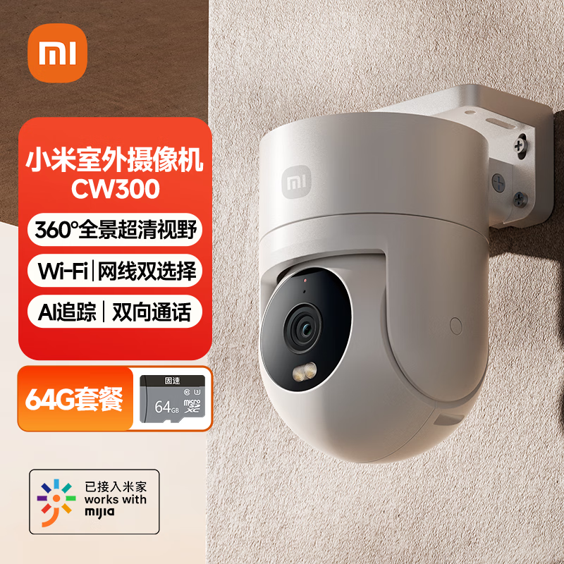 小米室外摄像头CW300+64G存储卡 家用监控器户外球机360度旋转全景400万全彩夜视防尘防水双向语音价格:249.00元!
