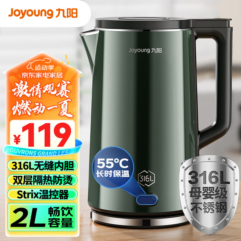九阳(Joyoung)热水壶烧水壶电水壶2L 无缝易洁内胆 316L不锈钢 恒温水壶 家用开水壶K20FD-W530价格:129.00元!