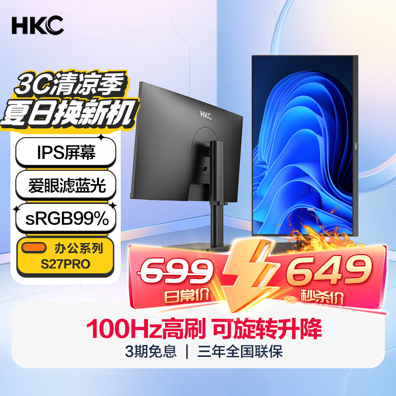 HKC 27英寸 IPS屏幕 100Hz显示器 爱眼滤蓝光不闪屏 高清广色域 旋转升降办公家用电脑显示屏 S27Pro价格:799.00元!