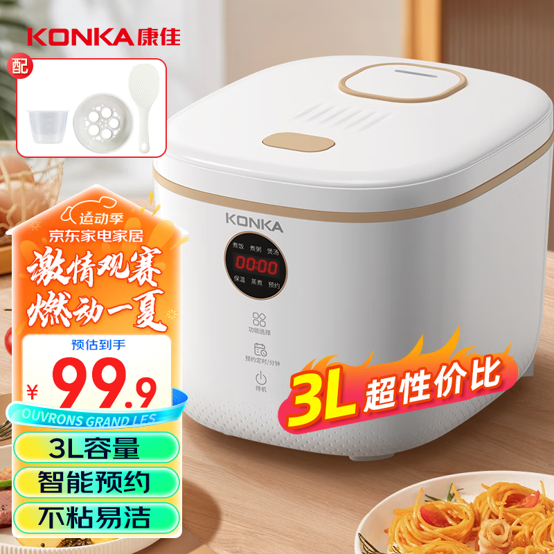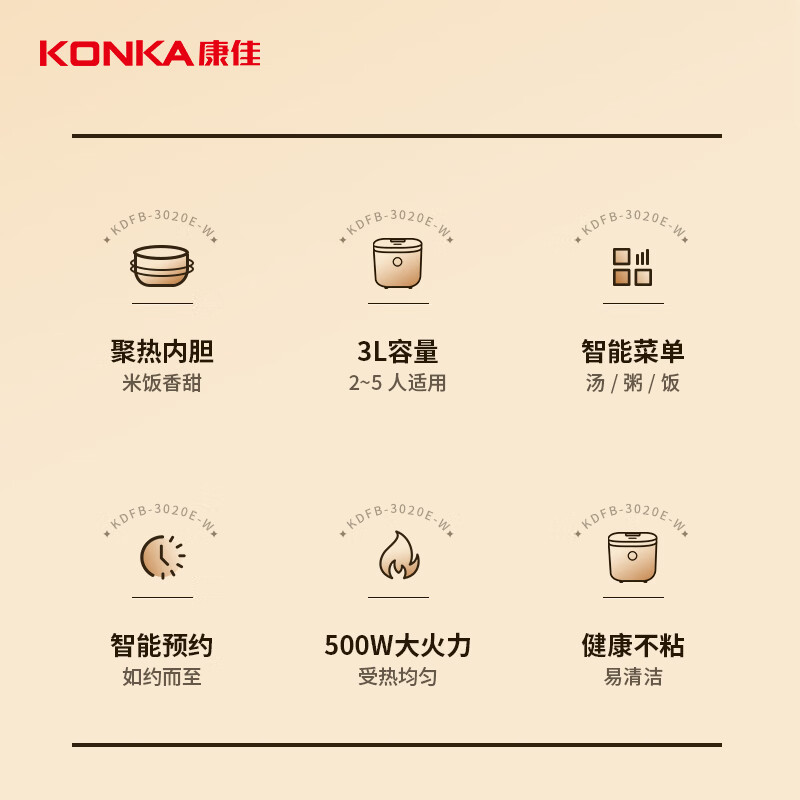 康佳(KONKA)电饭煲 家用智能预约 3L大容量2-6人煮饭煮粥锅辅食锅小电饭锅 KDFB-3020E-W价格:99.90元!