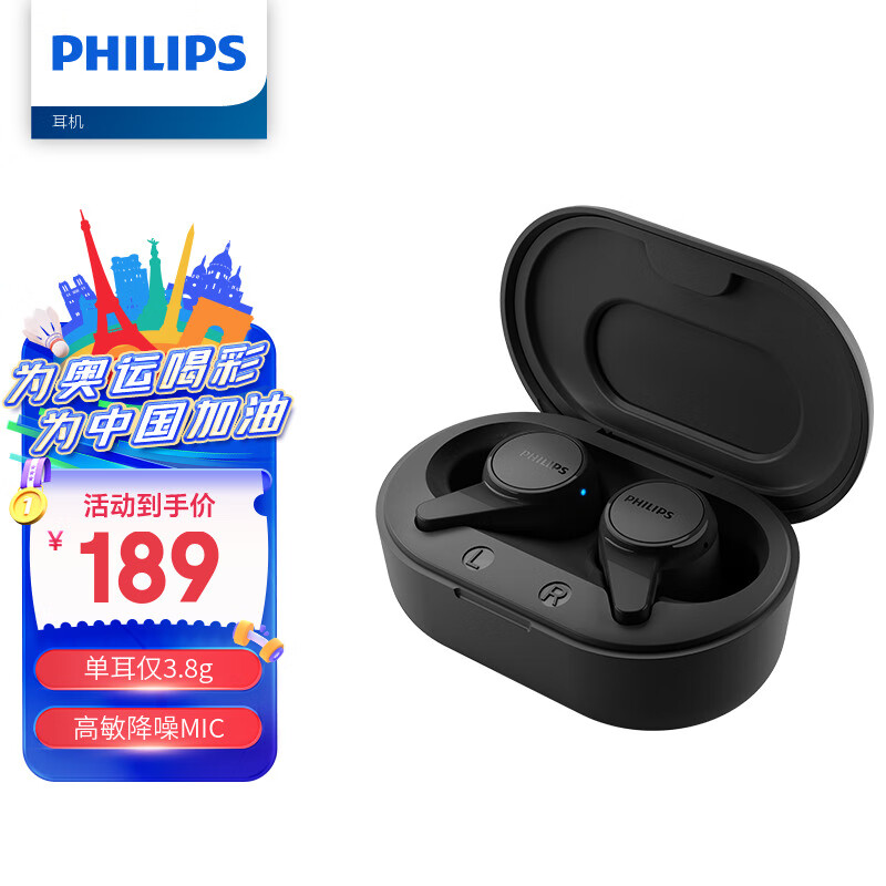 飞利浦(PHILIPS)真无线蓝牙耳机无线运动耳机游戏耳机回音降噪蓝牙5.2智能配对苹果华为手机TAT1207黑价格:189.00元!