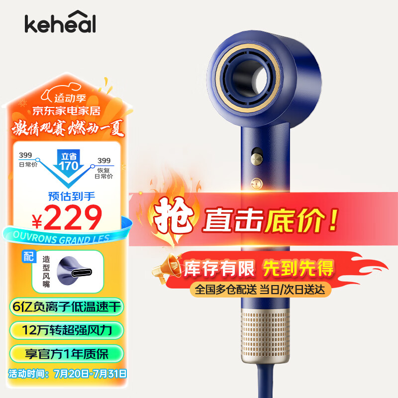 KEHEAL科西高速吹风机 家用静音负离子大风力大功率不伤发电吹风速干护发吹风筒礼物推荐 HC2曜金蓝价格:229.00元!