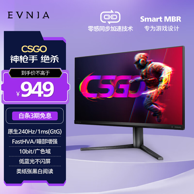 飞利浦 24.5英寸10Bit原生240Hz FastHVA 快速液晶1ms全高清 旋转升降 EVNIA游戏电竞显示器25M2N3200W价格:949.00元!