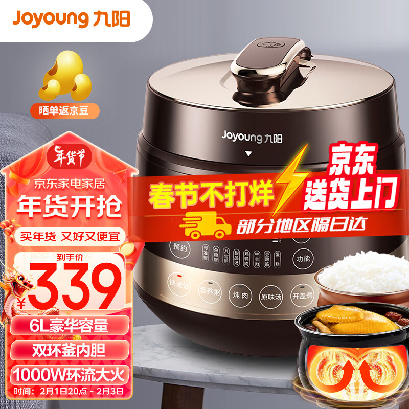 九阳(Joyoung)电锅煲煮饭煲6升1000W双环釜内胆半息多功能大屏智能预约定时年货送长辈送老人Y-60C90价格:369.00元!