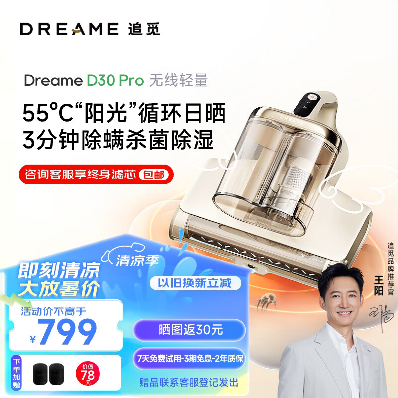 追觅家用无线手持除螨仪 床上吸尘器 除螨虫 360°强劲拍打长续航D30 Pro 家庭宠物适用价格:799.00元!