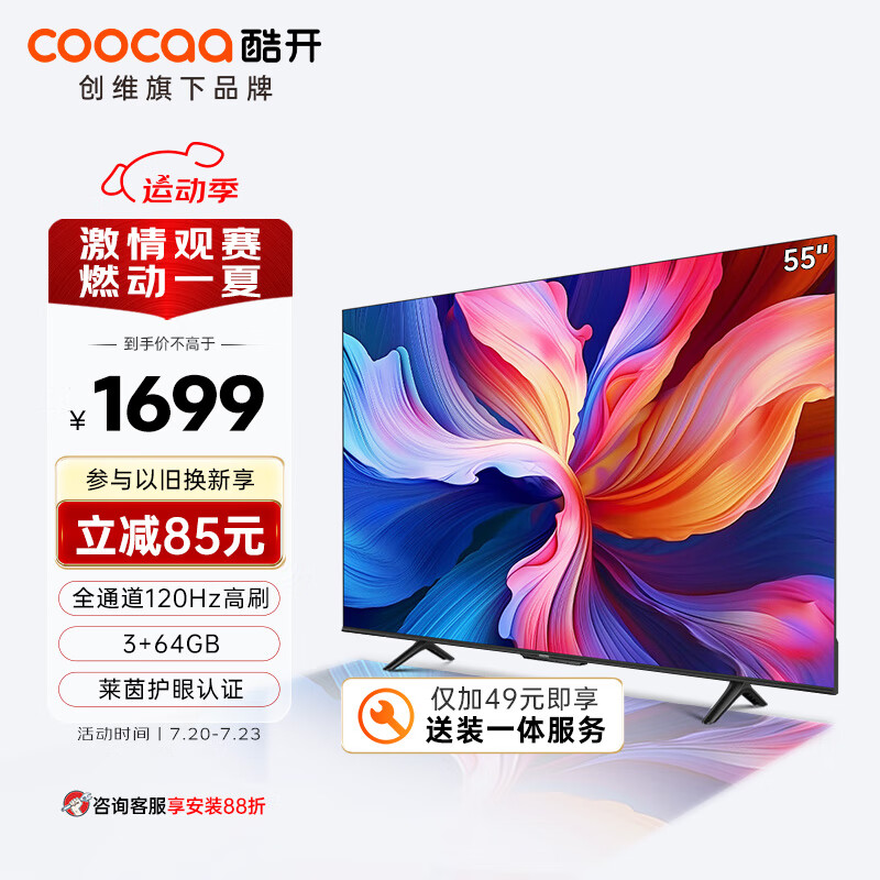 酷开创维K3 Pro 55英寸电视 120Hz高刷 3+64G 4K护眼 声控投屏液晶平板游戏电视机以旧换新55P3D Max价格:1699.00元!