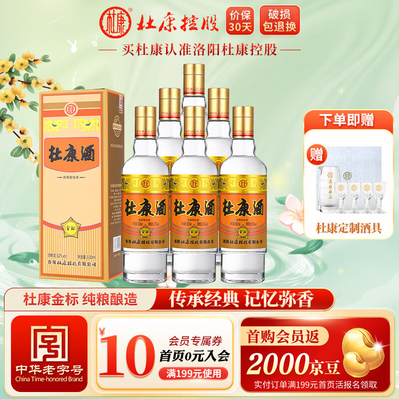 杜康金标白酒浓香型52度高度纯粮食酒高粱口粮酒送礼宴请 52度 500mL 6瓶 整箱装价格:608.00元!