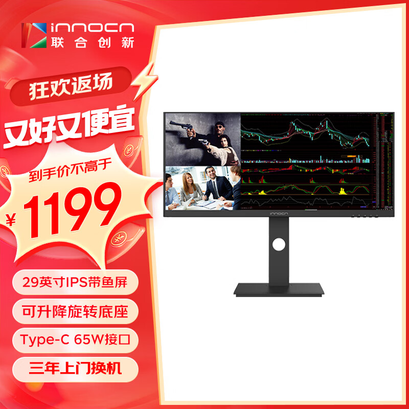 联合创新(INNOCN)29英寸 带鱼屏 准2K显示器IPS 21:9 Type-C65W旋转升降 内置音箱 电脑办公显示屏29C1F-D价格:1199.00元!