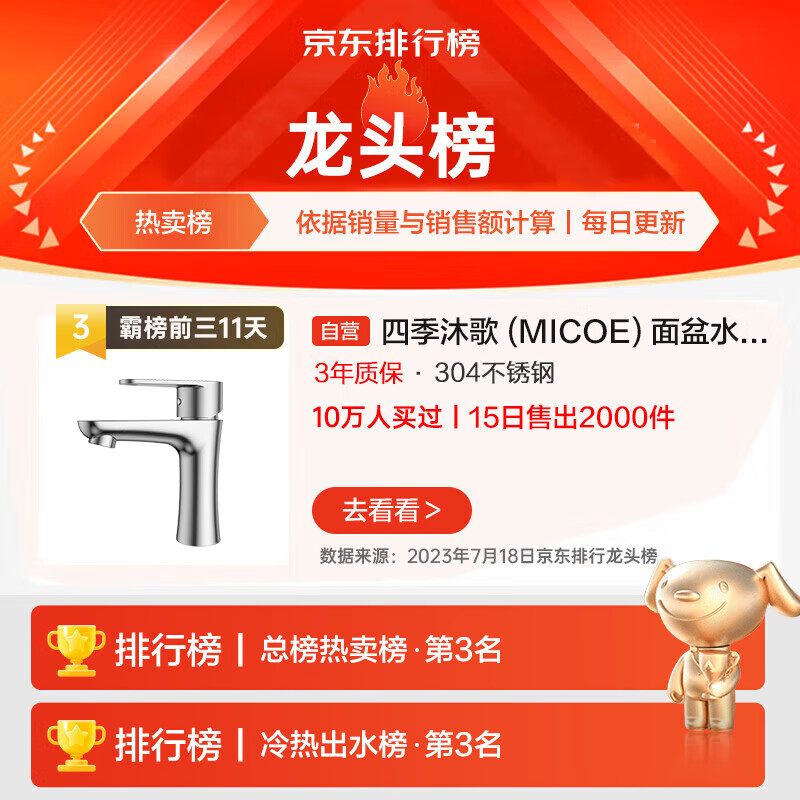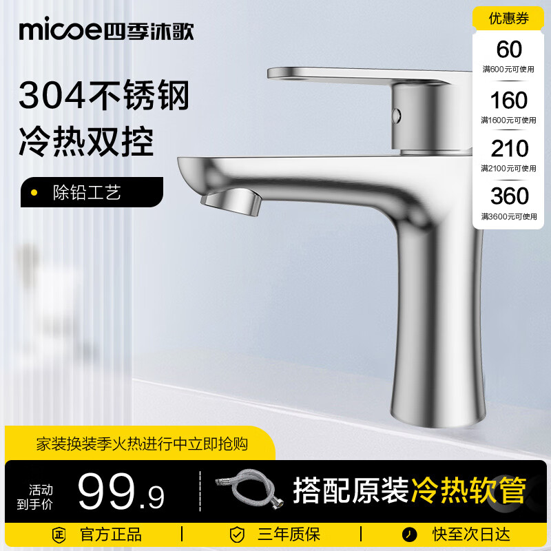 四季沐歌面盆水龙头304不锈钢冷热水龙头浴室卫生间洗脸盆台盆通用价格:129.90元!
