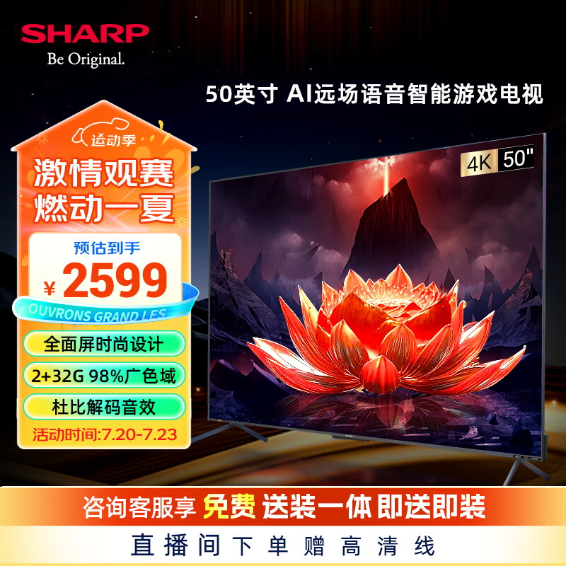SHARP夏普4T-C50A7EA 50英寸2+32G 98%广色域 HDR10+HLG 96.65%屏占比 杜比解码 超薄电视价格:2599.00元!